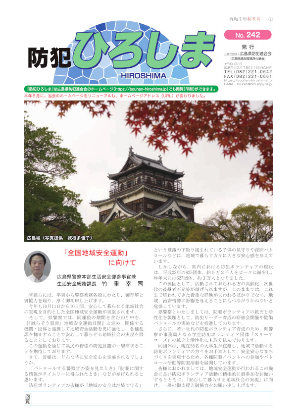 バックナンバー 2026年1月8日 by 広島県防犯連合会 No242(令和7年秋季号)PDFダウンロード(2.05MB) No241(令和7年夏季号)PDFダウンロード(1.29MB) No240 (令和7年春季号)PDFダウンロード(1.32MB) No239 (令和7年新春号)PDFダウンロード(1.29MB) No238 (令和6年秋季号)PDFダウンロード(1.38MB) No237 (令和6年夏季号)PDFダウンロード(2.46MB) No236 (令和6年春季号)PDFダウンロード(3.03MB) No235 (令和6年新春号)PDFダウンロード(3.05MB) 前のページにもどる